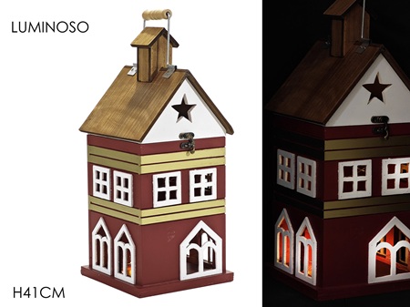 CASA MADEIRA COM LUZ 41CM BORDEAUX C/BRANCO 440211/00434